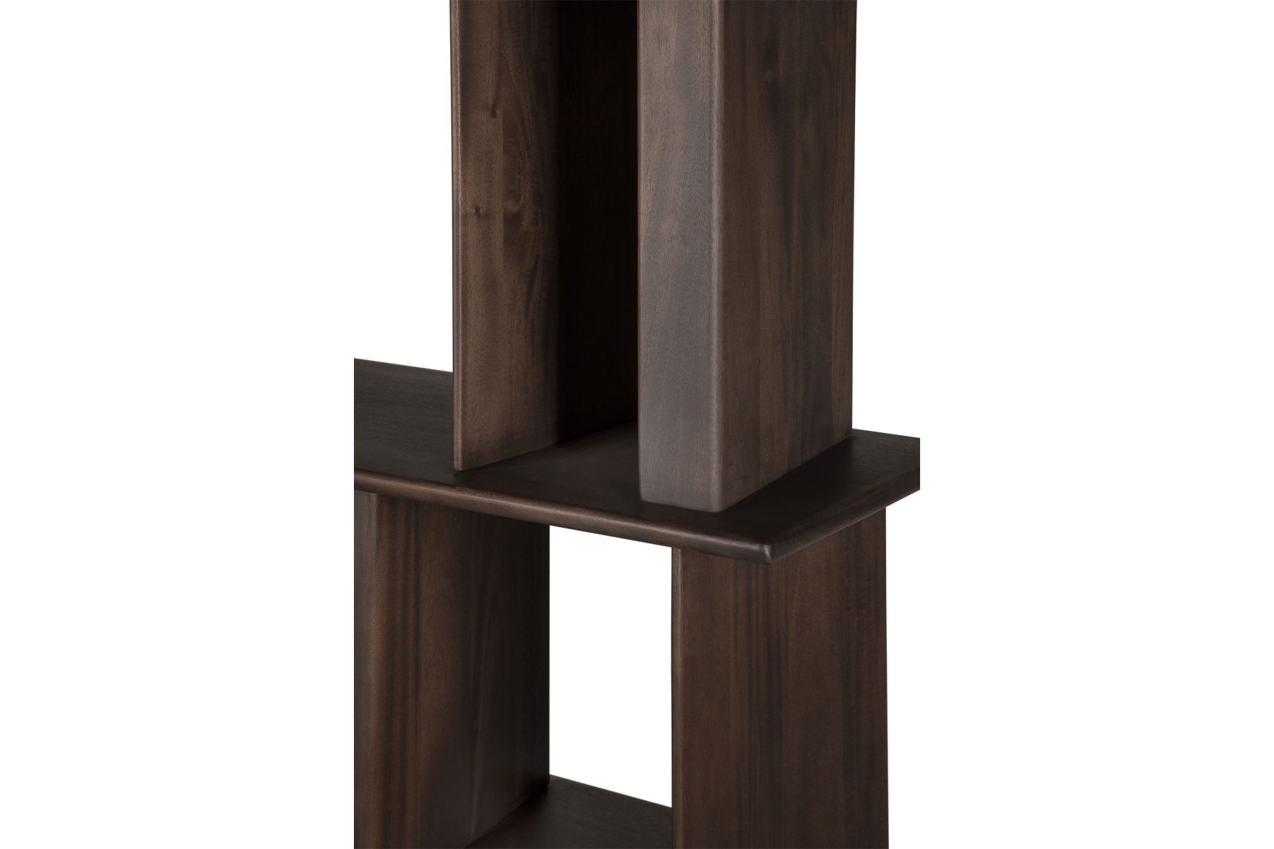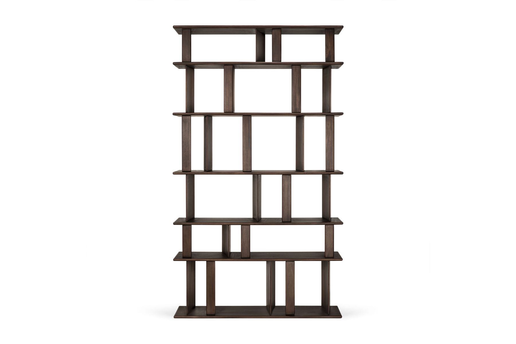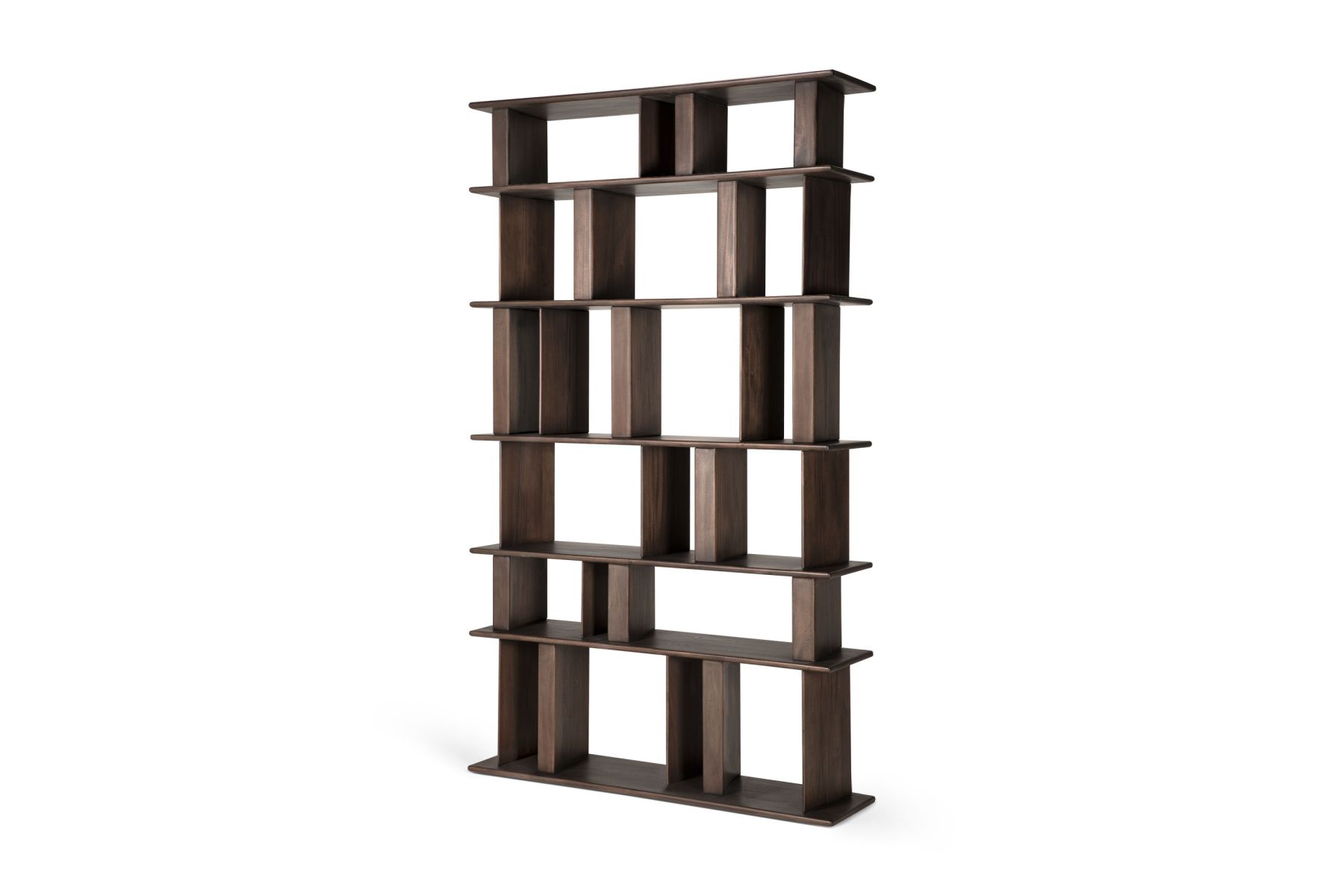 Een ritmisch samenspel van vorm en functie: het Block-rek voegt een sculpturaal accent toe aan alledaagse opbergruimte. Gemaakt van massief mahoniehout, zorgen de hoekige verdelers voor een dynamisch lijnenspel vanuit elke hoek – of het rek nu op zichzelf