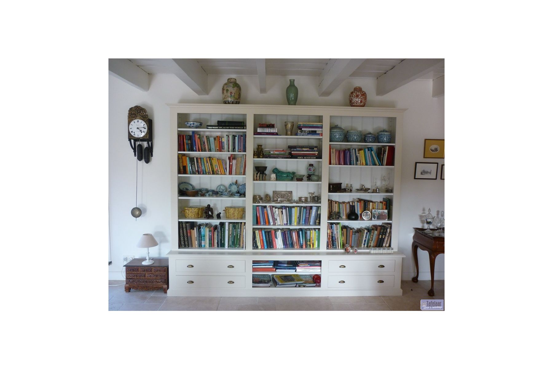 De boekenkast is door ons op maat gemaakt op basis van een schets, die wij hebben uitgewerkt tot een concepttekening met afmetingen. De boekenkast op maat zou met de hand geschilderd kunnen zijn, echter heeft de klant gekozen om de kast te laten spuiten in de kleur RAL-9010.