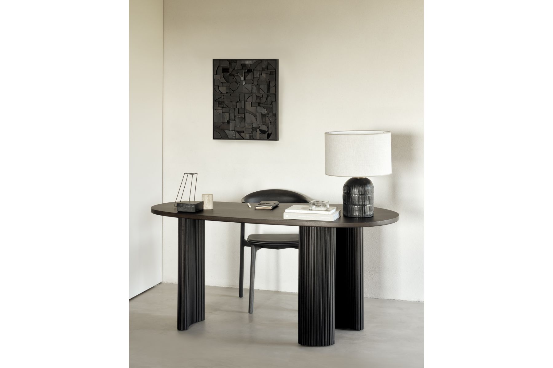 Boomerang bureaudoor Jacques DeneefGeïnspireerd door vormen uit de natuur, heeft de Boomerang-collectie een speels kiezelstenen blad op gebogen poten met een gestapeld houtstokjeseffect. Het Boomerang-bureau is een statement piece voor elke werkplek met z