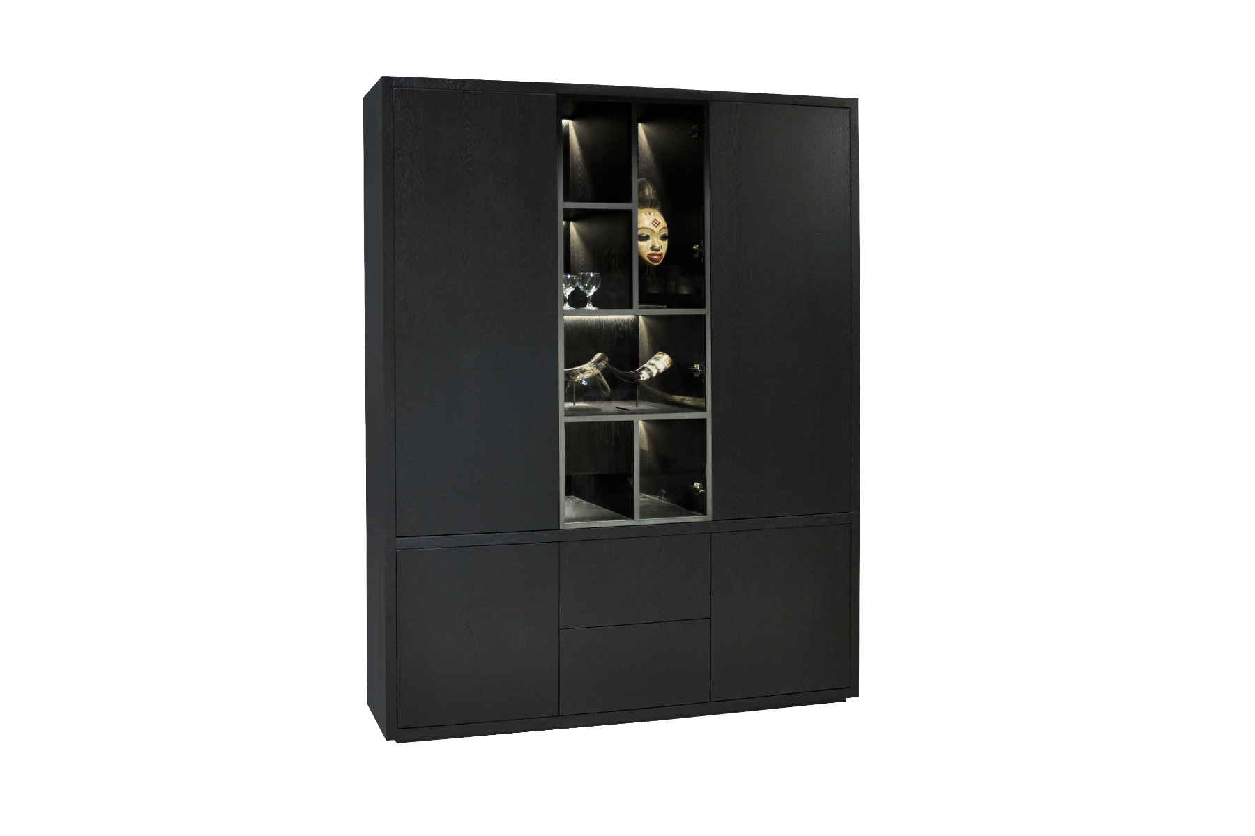 De eiken houten kast met zwart stalen deuren is de perfecte combinatie voor een stoere maar chique kast. Deze kast is heel goed te combineren met stalen taatsdeuren. Het massieve eikenhout met delen van hoogwaardig fineer is van hoge kwaliteit en een aanwinst voor elk interieur. De buffetkast is voorzien van soft close glazen deuren. De zwarte stalen details geven de kast een stoere uitstraling. De versprongen indeling maakt deze dat deze kast een speels en luchtig. Daarnaast heeft deze kast ook nog 2 gesloten deurtjes met daarachter een extra plank. Hier kunt u spullen uit het zicht opbergen.