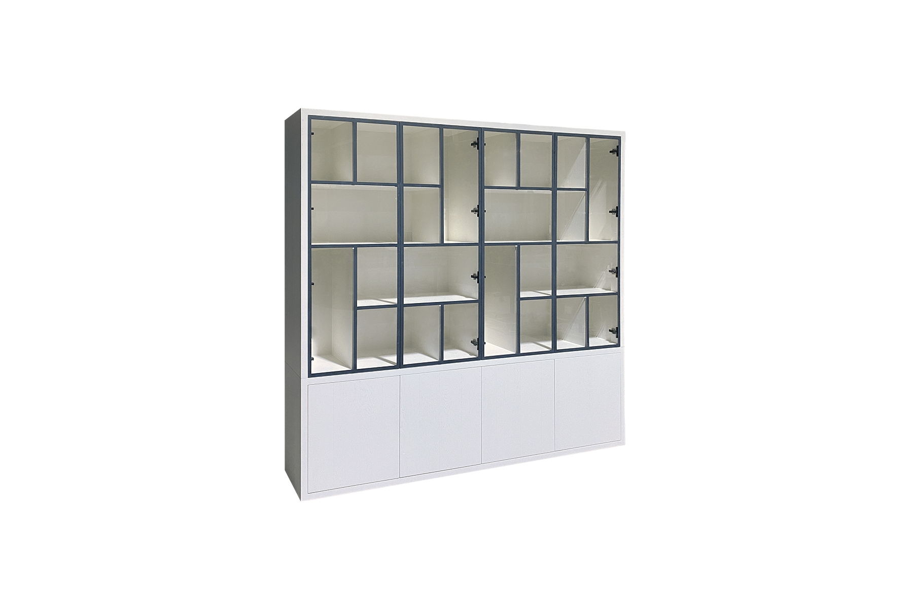 EGK099 Glaskast eiken rustiek PUUR/DUNE 4drs eiken/ 4drs metaal versprongen (230x241x40 cm) is beschikbaar om te kopen in verhogingen van 1