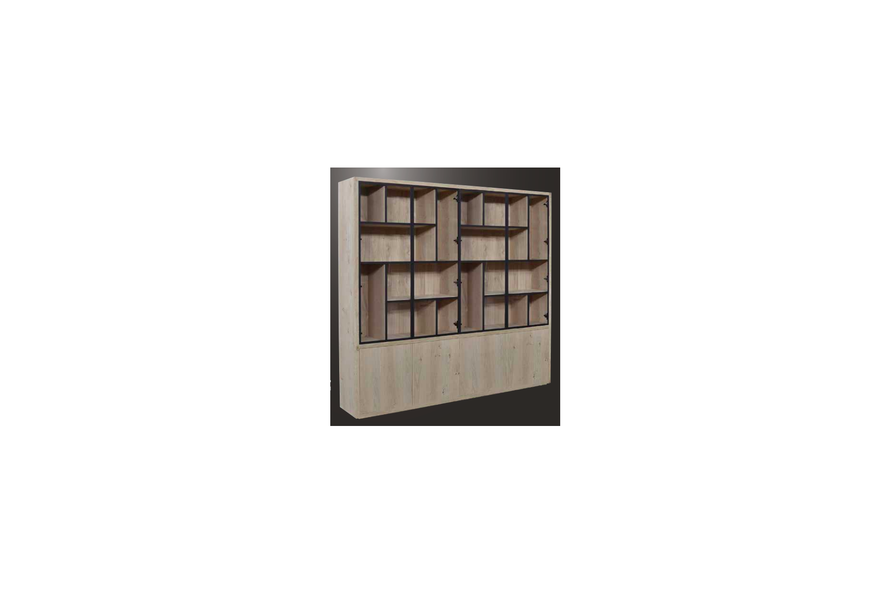 EGK099 Glaskast eiken rustiek PUUR/DUNE 4drs eiken/ 4drs metaal versprongen (230x241x40 cm)