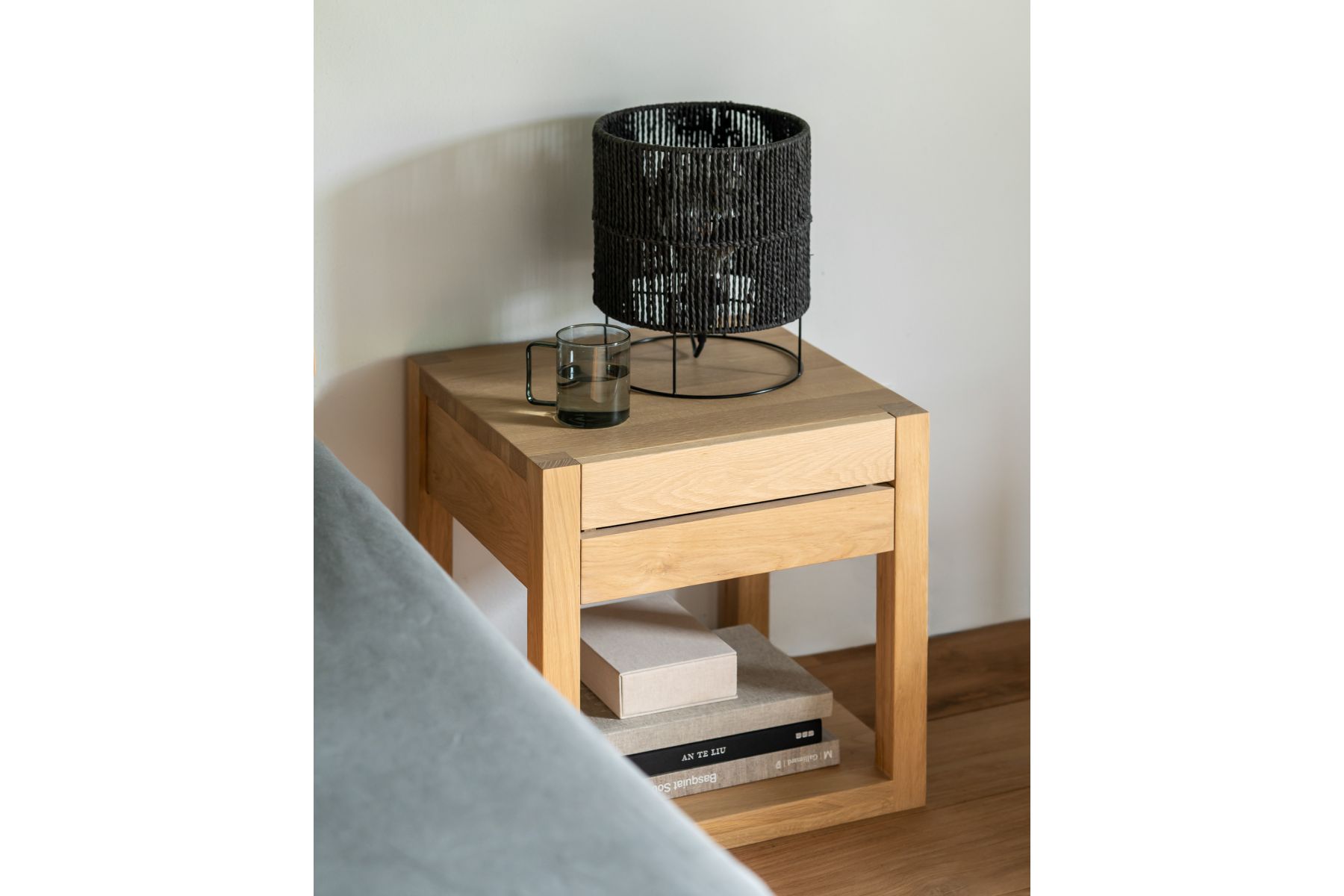 Dit massief eiken nachtkastje staat bijzonder goed bij het Azur bed. Het Azur nachtkastje heeft één lade.