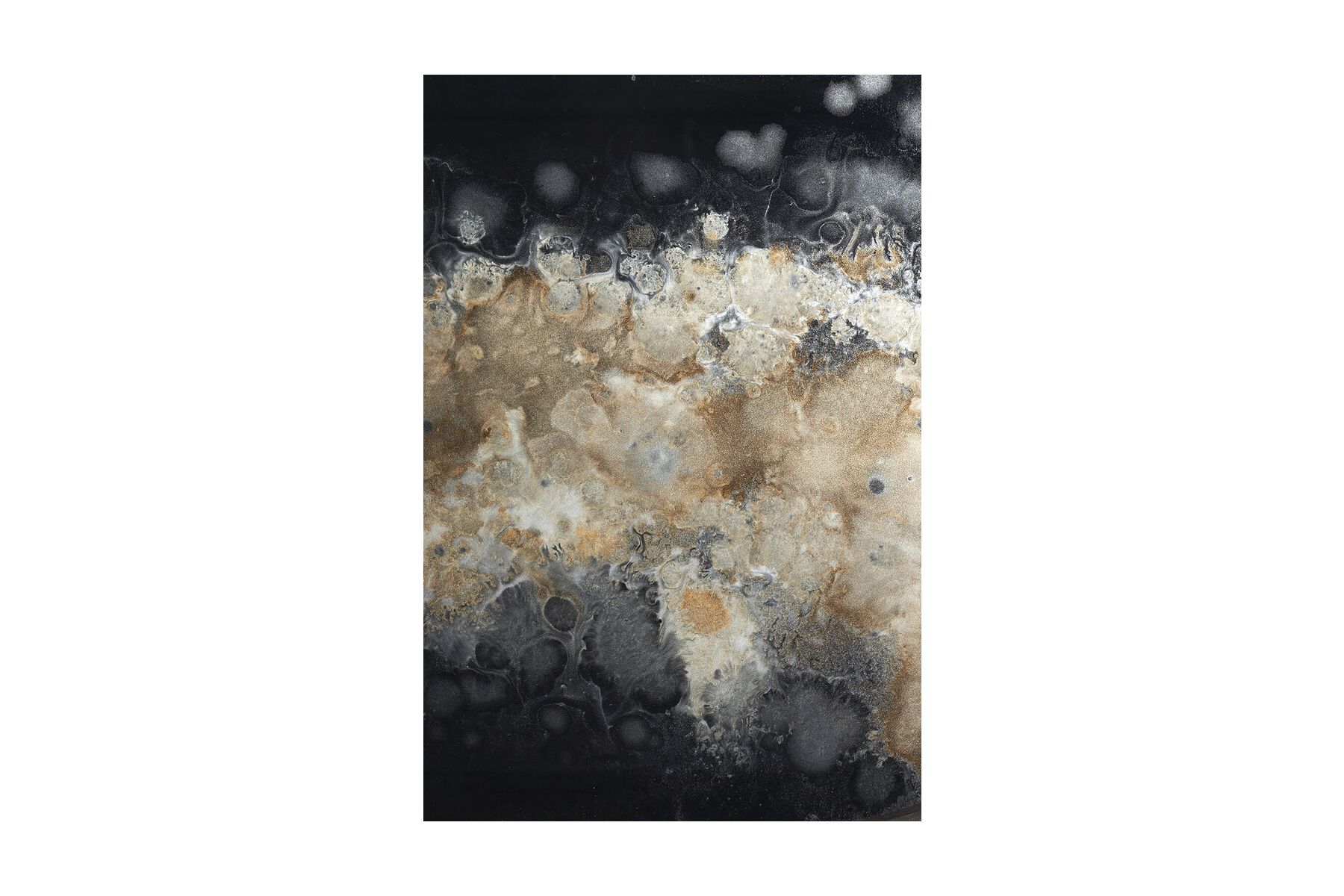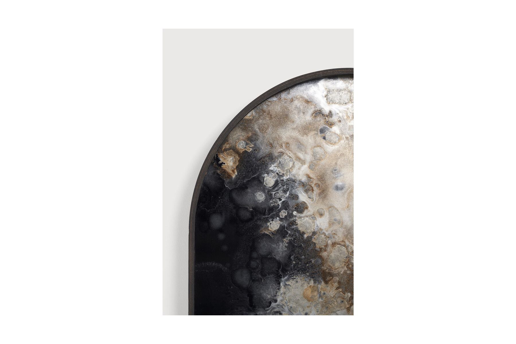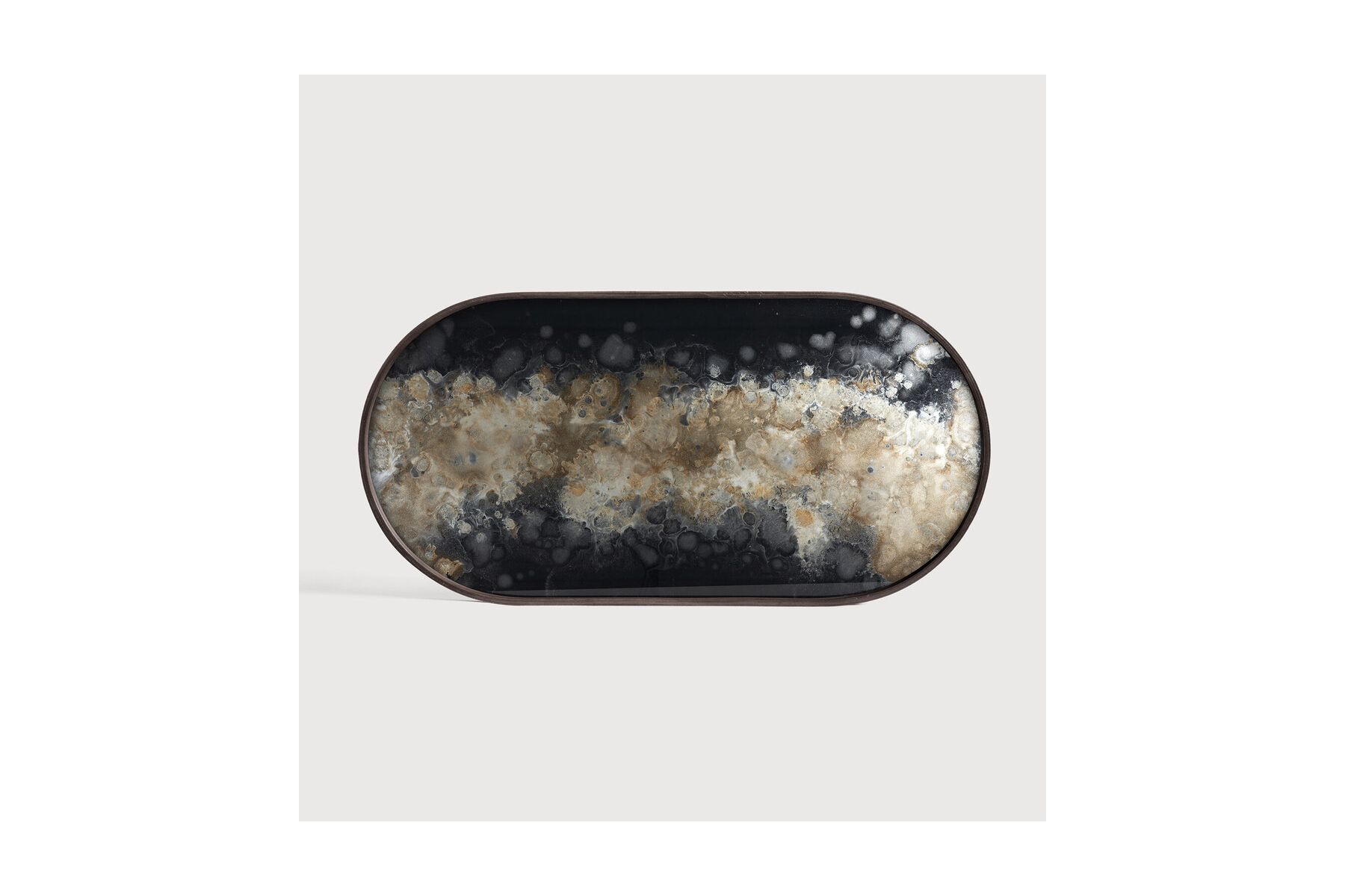 Een ingetogen kleurenpalet ontmoet betoverende motieven, geïnspireerd door de natuur en reizen. Dit Black Organic glazen dienblad experimenteert met het evenwicht tussen rijke patronen en gedempte tonen, waardoor de schoonheid achter de bedrieglijk alledaagse onderwerpen onthuld wordt. Zo vangt deze collectie de essentie van tijdloosheid. Handgeschilderd glas met een houten rand.