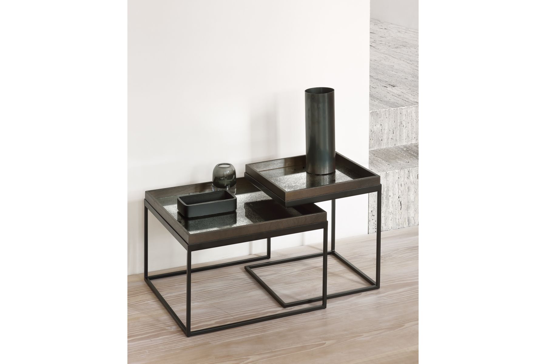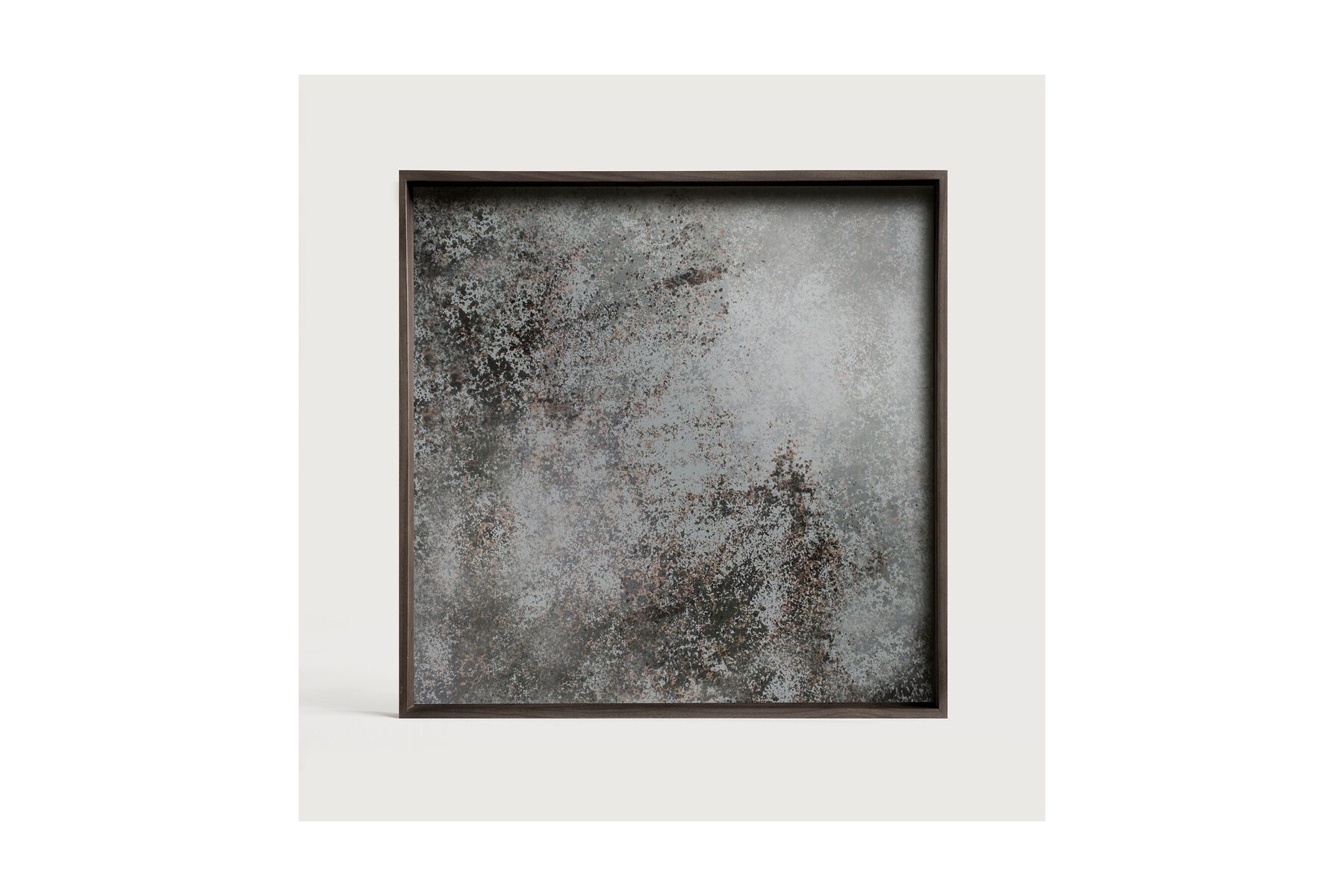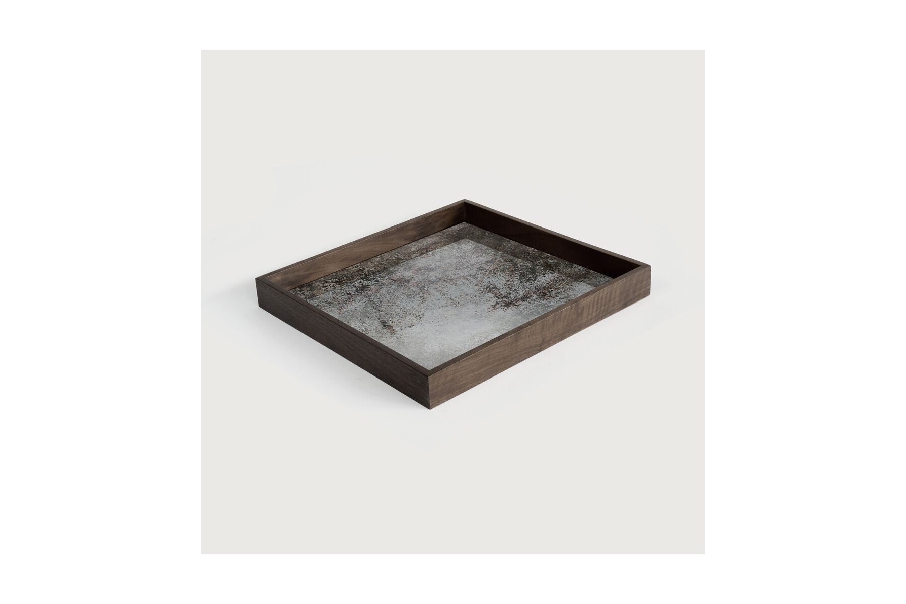Een ingetogen kleurenpalet ontmoet betoverende motieven, geïnspireerd door de natuur en reizen. Dit Clear spiegel dienblad experimenteert met het evenwicht tussen rijke patronen en gedempte tonen, waardoor de schoonheid achter de bedrieglijk alledaagse onderwerpen onthuld wordt. Zo vangt deze collectie de essentie van tijdloosheid. Te combineren met de dienblad bijzet- en koffietafels.Verouderde spiegel - houten rand.