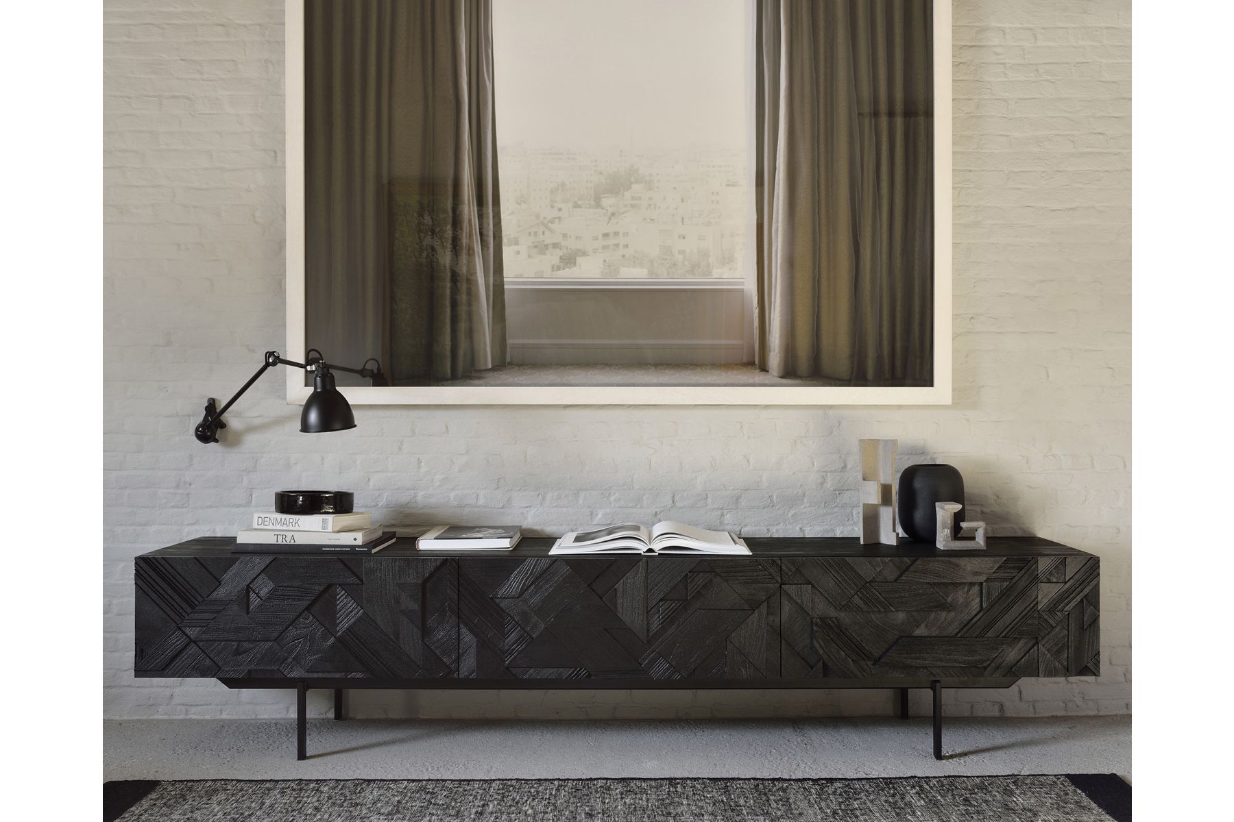 ETHNICRAFT GRAPHIC TV CUPBOARD 1DOOR-2DRAWERS 240x45x51 WITH TEAK VENEER PANEL AND METAL LEGS 10064