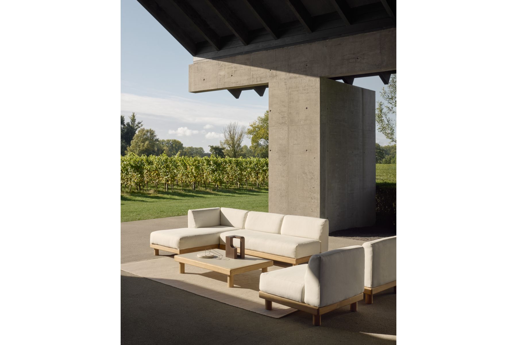De Monocle combineert elegantie en strakke lijnen in een ontspannen silhouet en voelt verfijnd, uitnodigend en stabiel aan. De zachte kussens brengen het comfort van binnen naar buiten, terwijl de massief houten basis het meubelstuk warmte en balans geeft