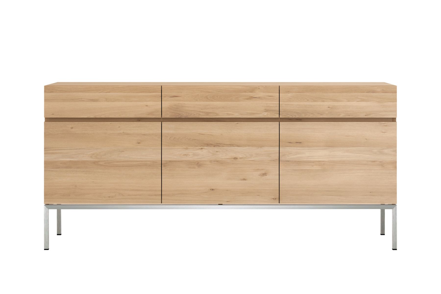 De Ligna buffetkast uit massief eikenhout vormt, met zijn zuivere en pure look met RVS onderstel, een ideale opslagruimte voor in de keuken, woonkamer of eetkamer.