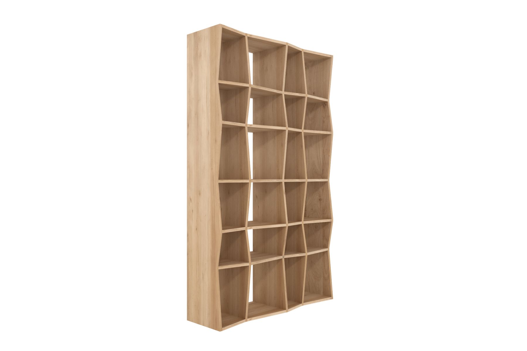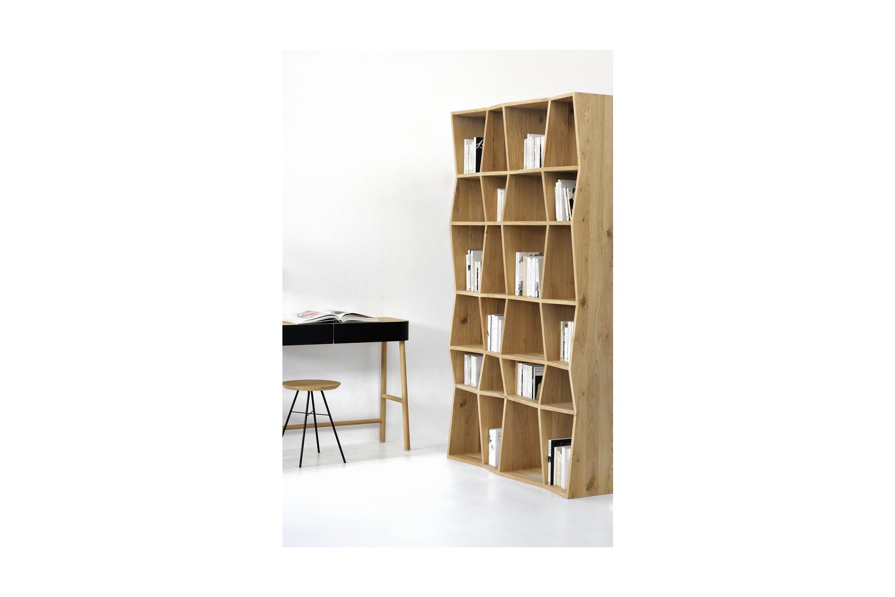 Het terugkerende spel van lijnen en schaduwen van het Z-rek, ontworpen door Alain van Havre, geven het een uniek uiterlijk en benadrukken het karakter van het natuurlijke hout. Gemaakt van massief eiken en behandeld met hardwaxolie.