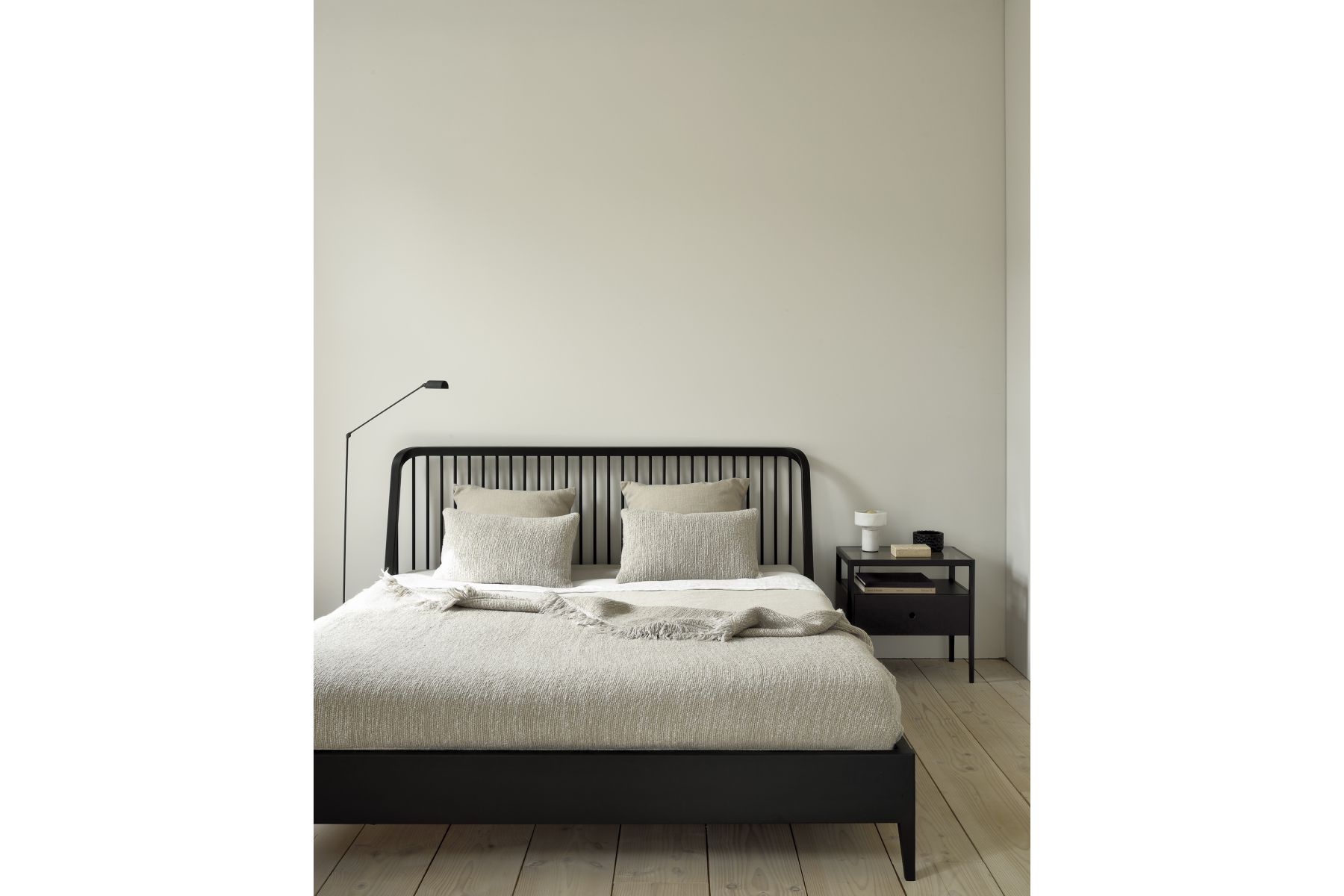 Met zijn enkele lade, open ruimte en iets taps toelopende poten, is het Spindle nachtkastje van notenhout de ideale no-nonsense metgezel voor het schitterende Spindle bed.