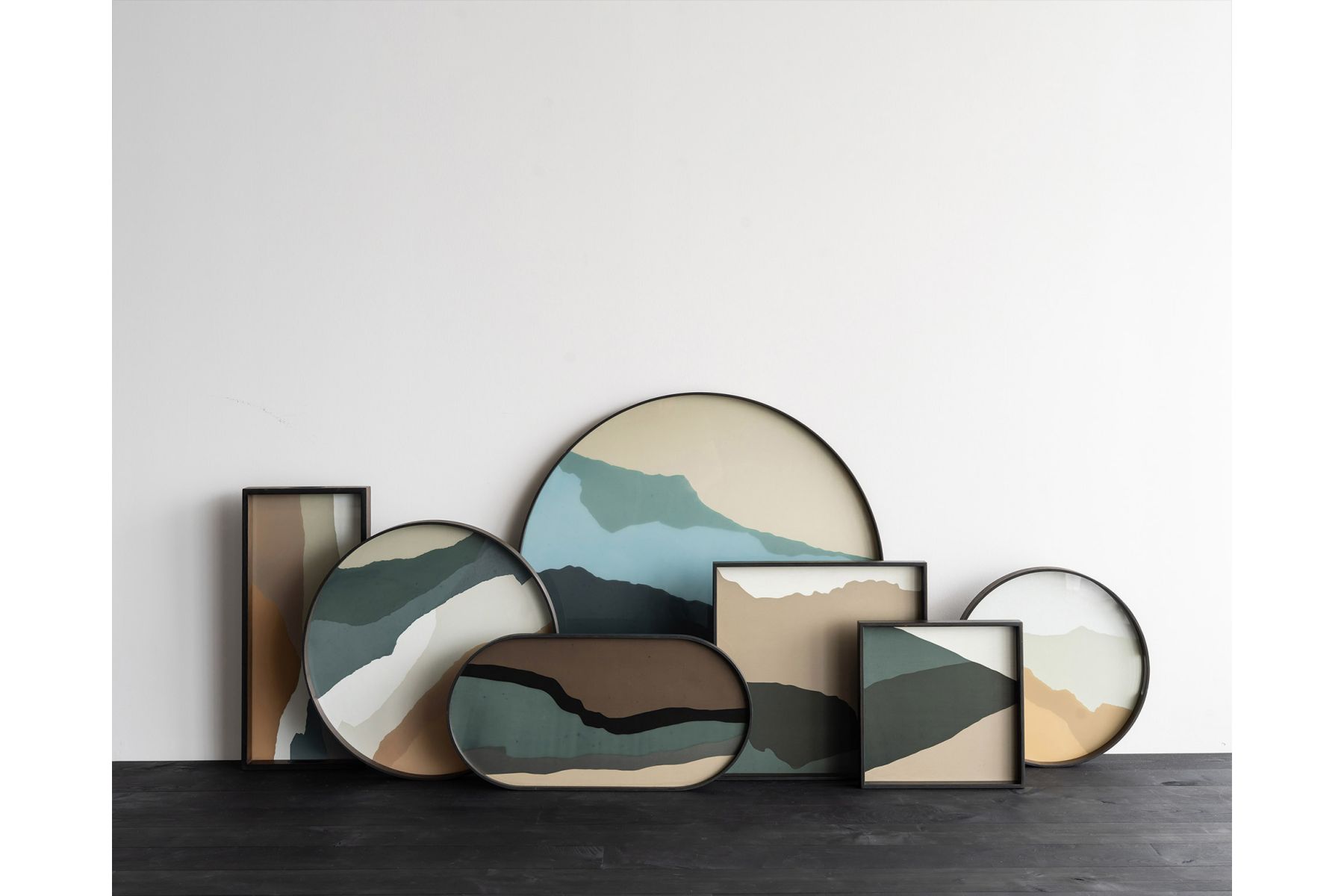De Wabi Sabi collectie van glazen dienbladen vindt zijn inspiratie in de natuur. Ontwerper Dawn Sweitzer vertelt: “Terwijl ik door de Blue Ridge Mountains reisde, deed het uitzicht me denken aan een gelaagde aquarel. De blauwe lucht en grijze, mistige kleuren vormden lagen aan de horizon. Toen de zon onderging veranderde het kleurenpalet helemaal in warme herfstkleuren zoals sienna, zand en sepia.” Of hoe men schoonheid kan vinden in het niet zo perfecte.