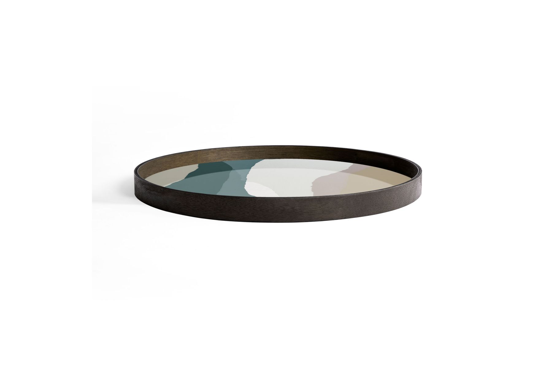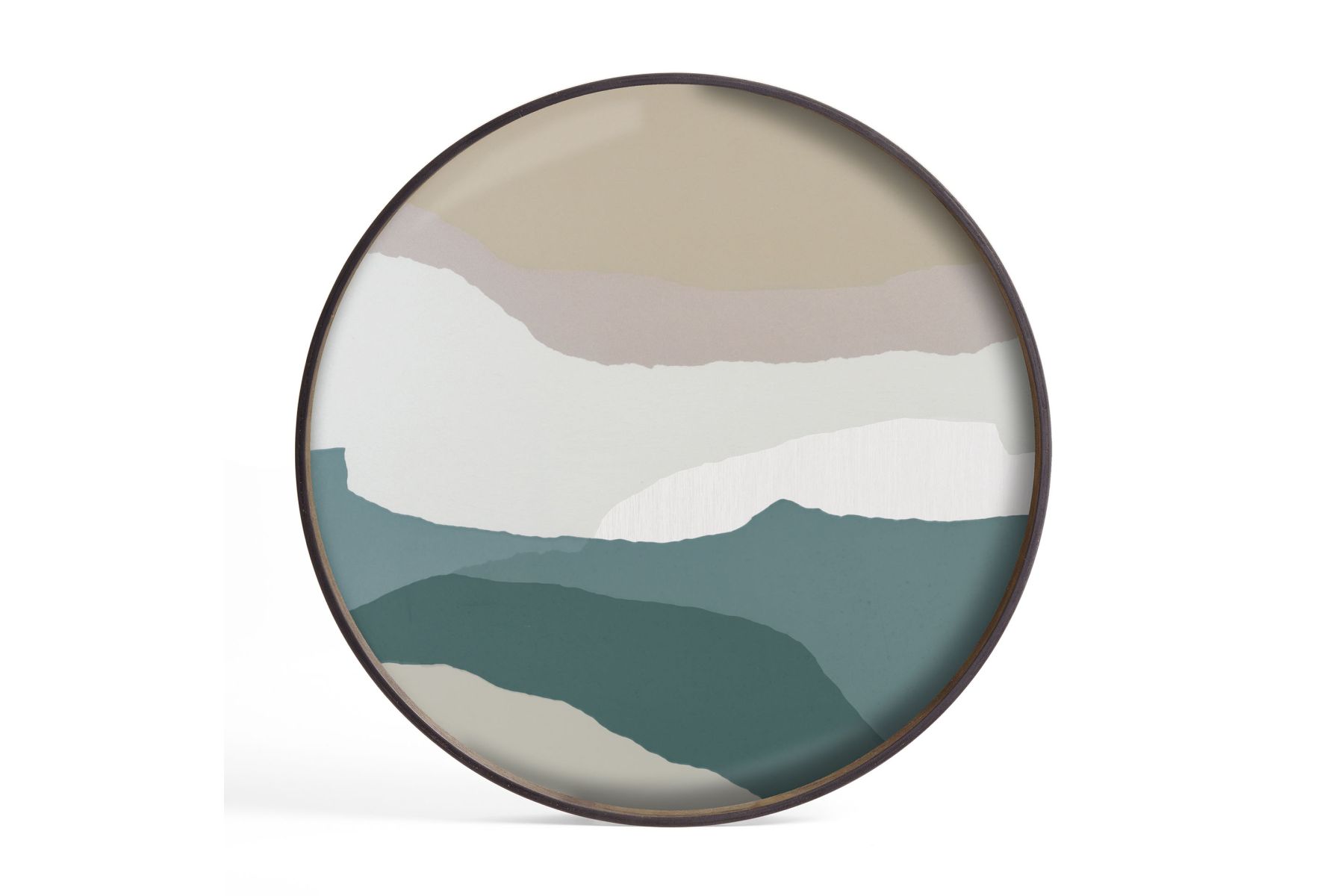 De Wabi Sabi collectie van glazen dienbladen vindt zijn inspiratie in de natuur. Ontwerper Dawn Sweitzer vertelt: “Terwijl ik door de Blue Ridge Mountains reisde, deed het uitzicht me denken aan een gelaagde aquarel. De blauwe lucht en grijze, mistige kle