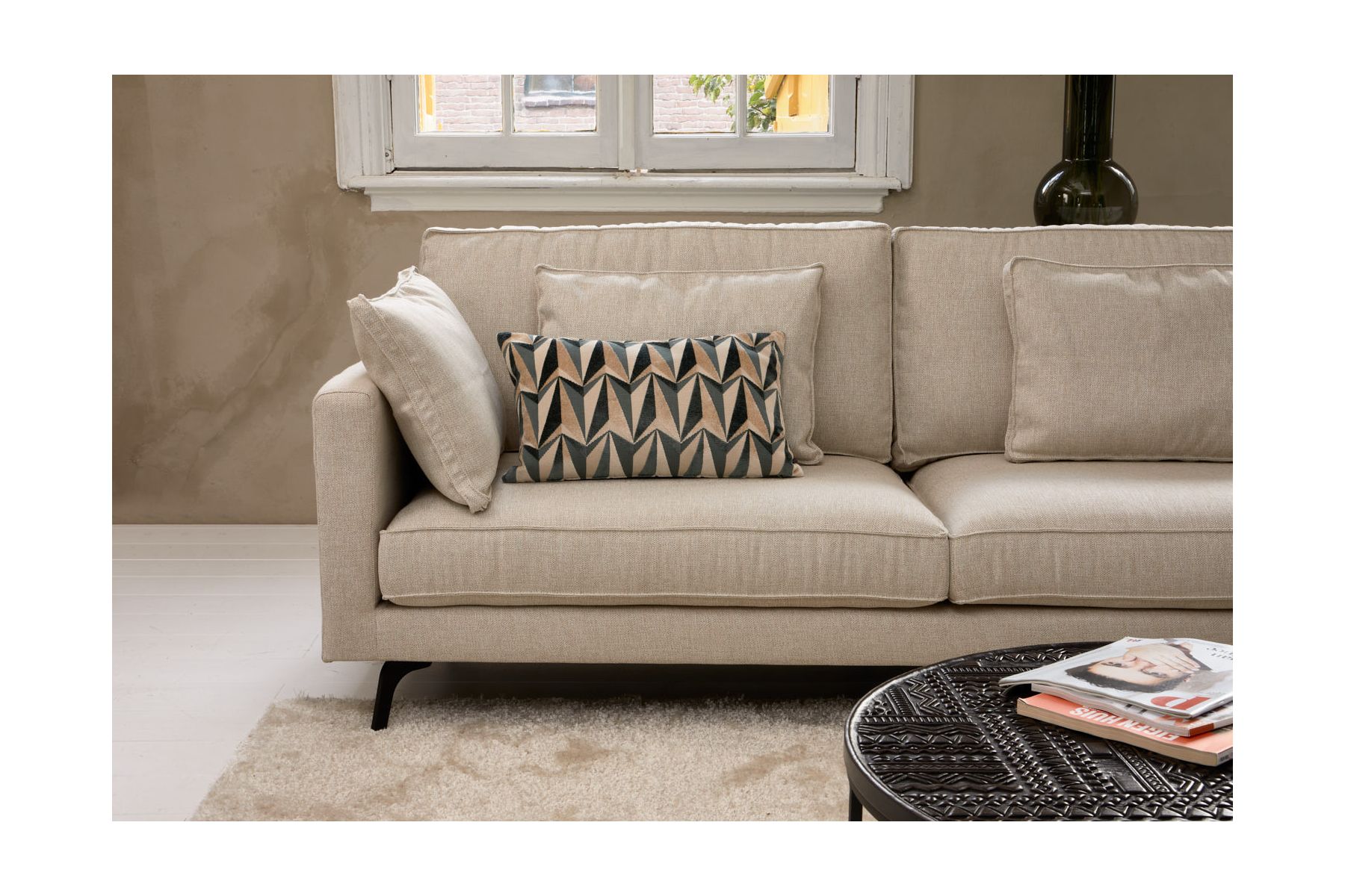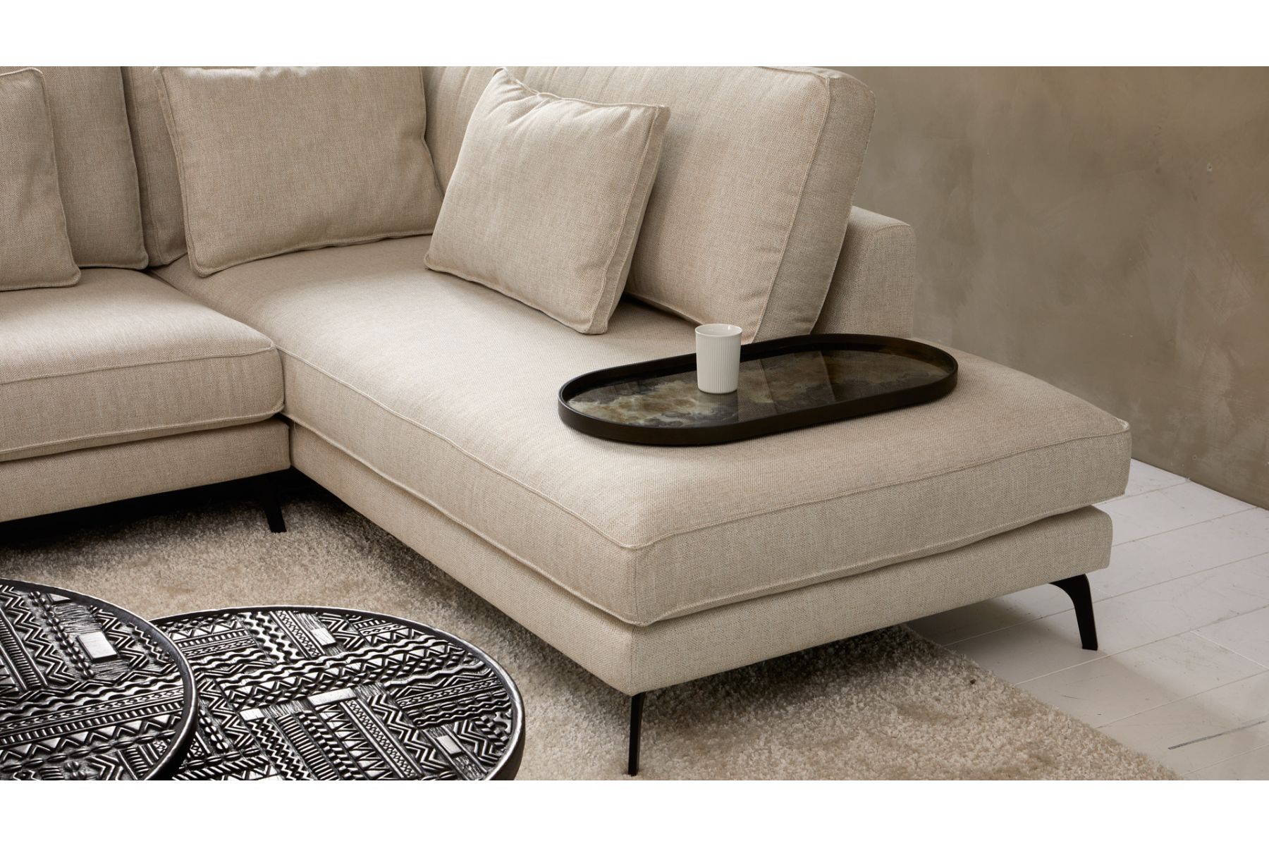 Deze hoekbank “Haveli Dreams” is uitgevoerd in een prachtige sterke grove linnenlook stof. Hij staat op strakke sierlijke poten voor een ruimtelijk effect in jouw woonkamer. Creëer jouw eigen droombank dat past in jouw interieur door de ruime keuze aan bankopstellingen en prachtige stoffen.