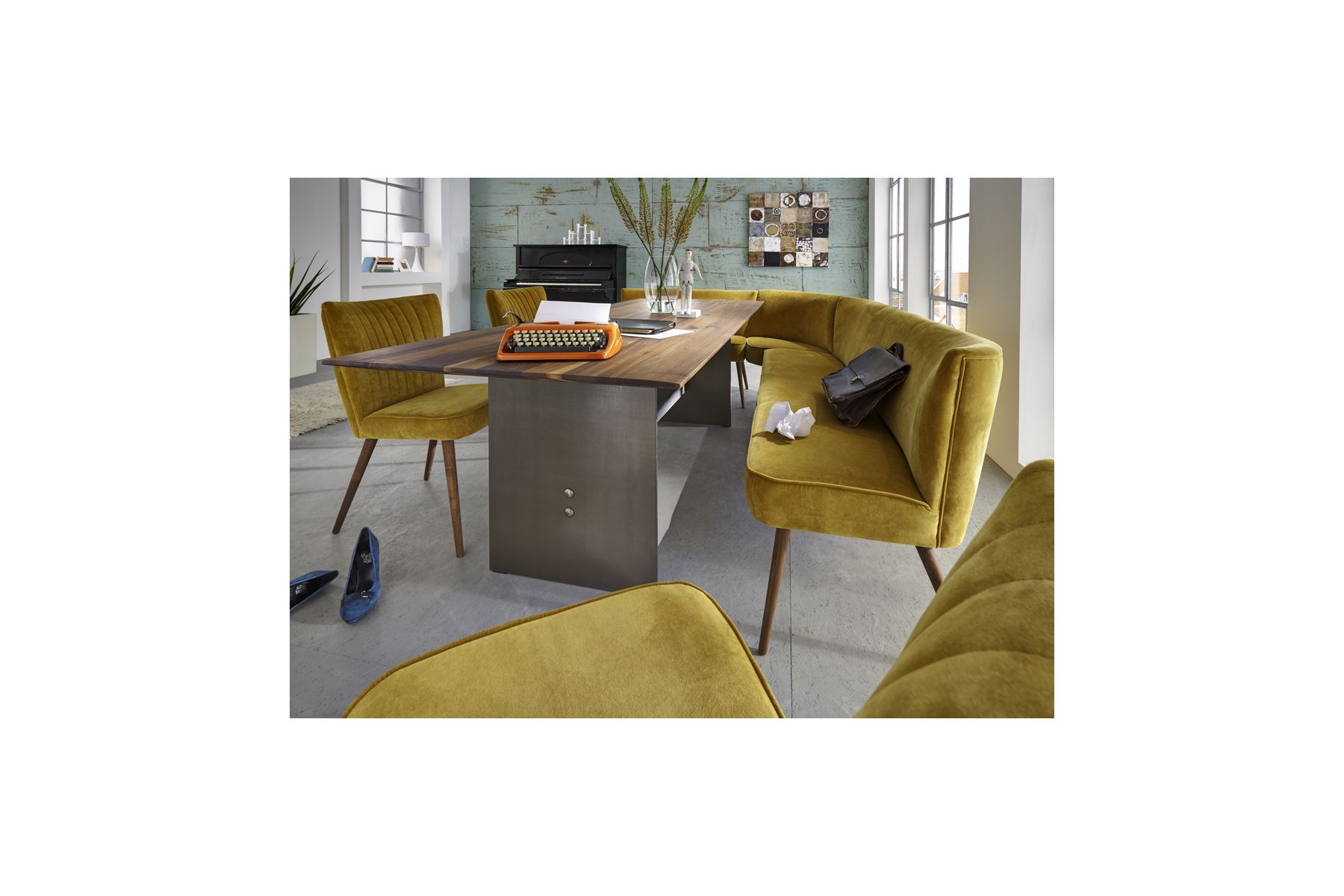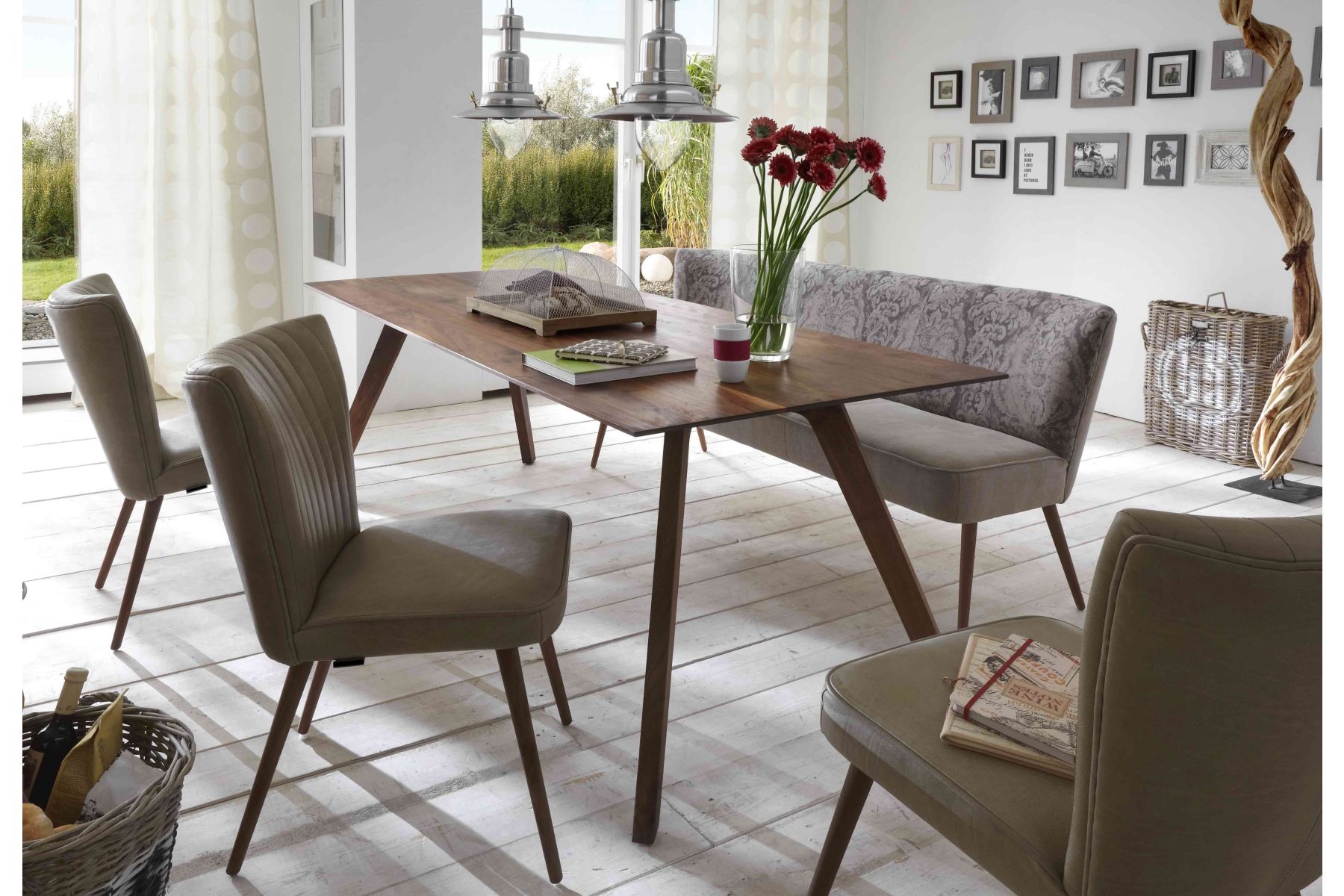 De tafel en het bankje zijn in verschillende afmetingen te verkrijgen, zowel in eiken- en notenhout. De poten van de eetkamerstoel en het eetkamerbankje zijn in notenhout uitgevoerd.