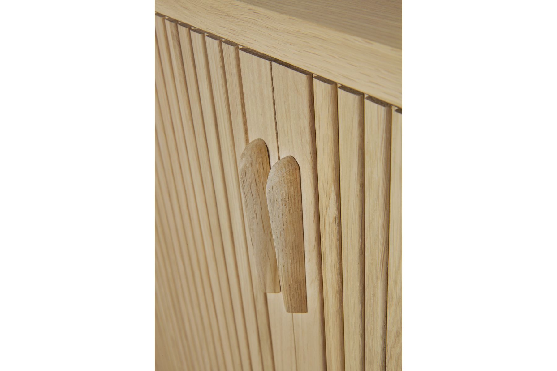 De Roller Max buffetkast biedt functionele opbergruimte in een opvallend design. Met schuifdeuren, verstelbare legplanken en naadloos geïntegreerde handgrepen benadrukt dit meubel het geritmeerde houten effect van de collectie op prachtige wijze. Het resu