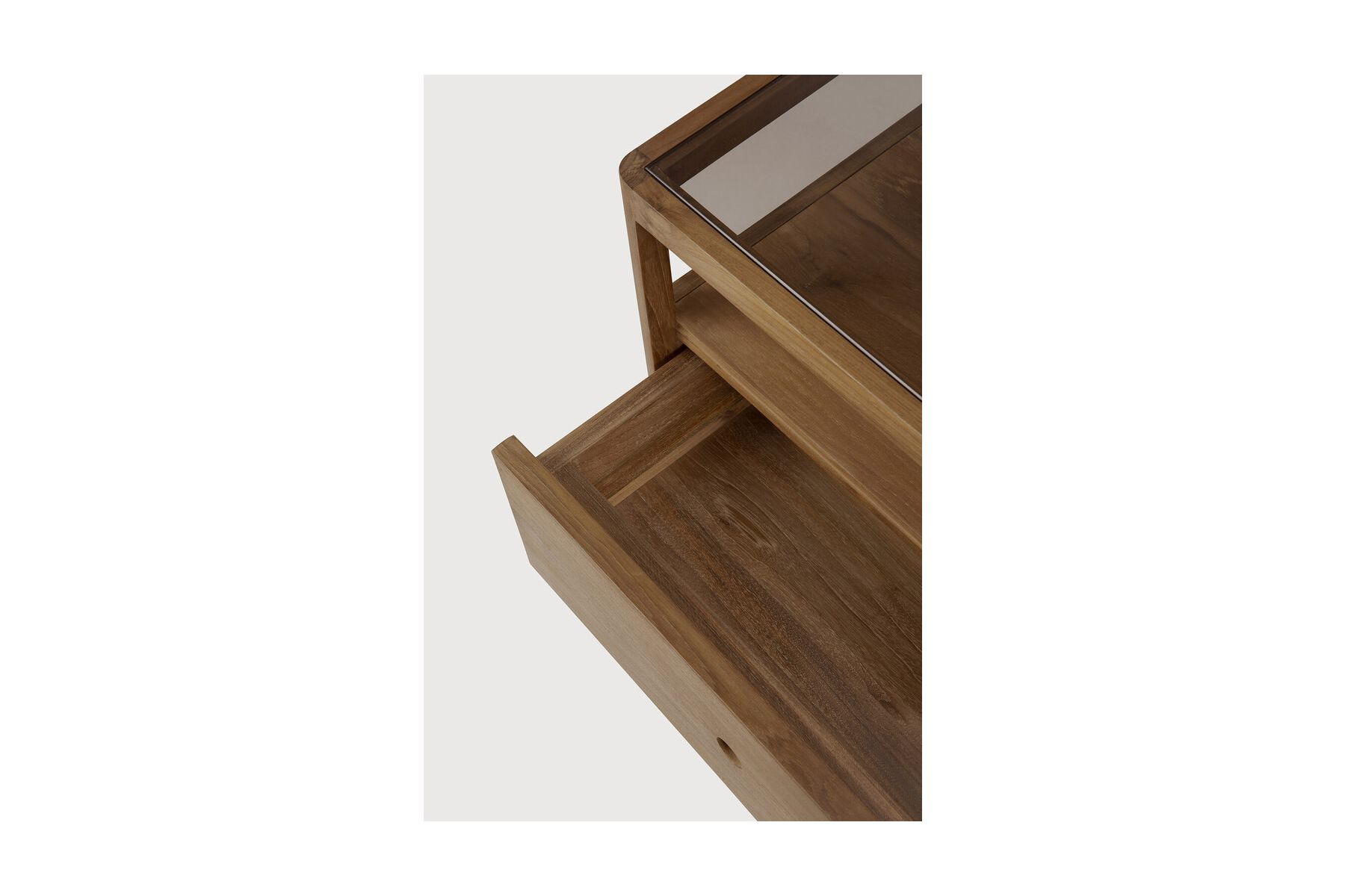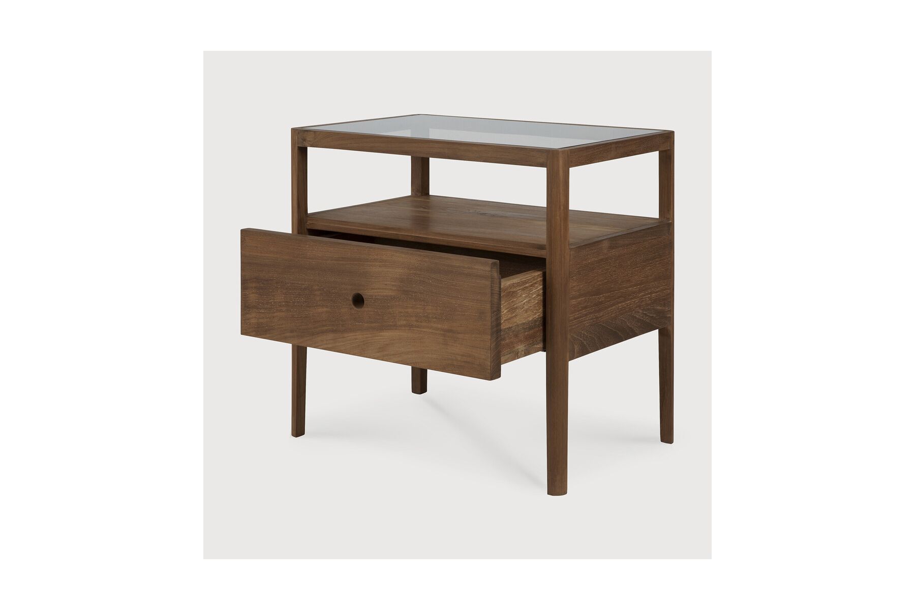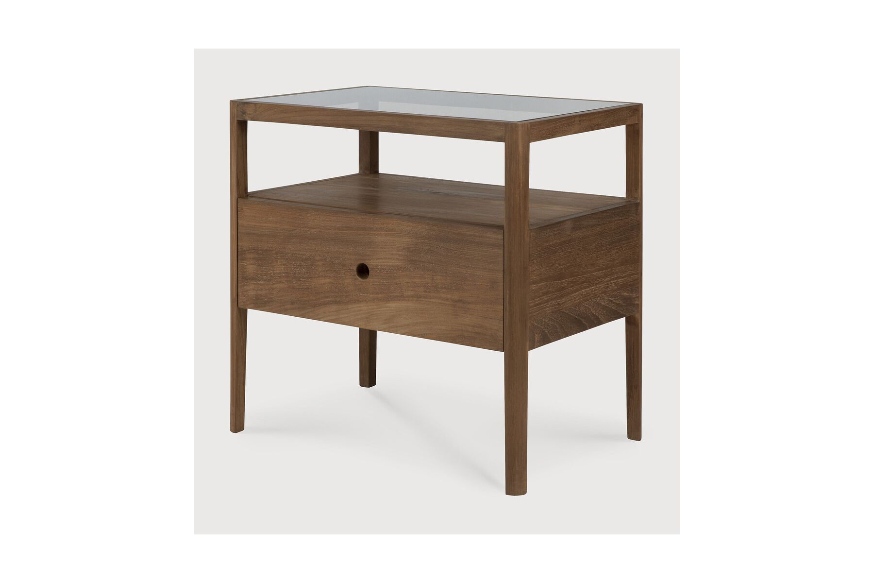 Spindel nachtkastjeMet zijn ene lade, open ruimte en licht taps toelopende poten is het Spindle nachtkastje de perfecte, no-nonsense aanvulling op het opvallende Spindle bed. Hergebruikt teakhout biedt een werkelijk unieke afwerking voor elk item – de oor
