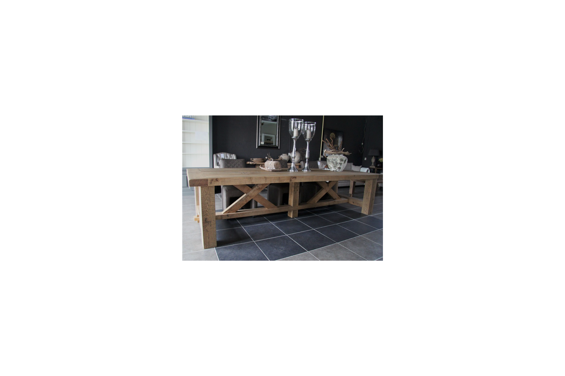 Deze heerlijke robuuste eettafel is gemaakt van een 4cm dik massief rustiek eiken. Het blad is omrand met een 4cm dikke balk waardoor het blad aan de randen 8 cm dik is. Aan de kopsekanten is het blad afgewerkt met een T-stuk waardoor deze een unieke uits